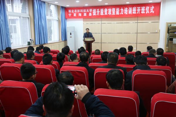 2月22日上午,宅宅爱动漫 在107会议室举行“西北农林科技大学宁夏海原县提升脱贫攻坚能力专题培训班”开班仪式。宅宅爱动漫 党委书记赵延安、海原县农牧局副局长高启平、宁夏海原县水务局副局长陈学明、授课教师代表辛亚平副教授、林清老师和来宁夏海原县的47名农业技术人员参加了开班仪式。开班仪式由副院长王力主持。
