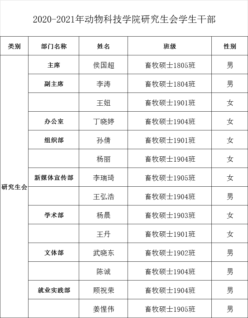 按照工作安排,经学生个人申请、宅宅爱动漫 研究生会学生干部换届领导小组进行资格审查,经2020年8月24日“动科宅宅爱动漫 2020-2021学年研究生会学生干部换届选举大会”选举,建议由下列人员作为动科宅宅爱动漫 2020-2021学年研究生会学生干部,现公示如下: