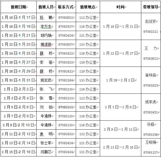 注:1.值班时间:上午8:30-11:30,下午2:30-5:30