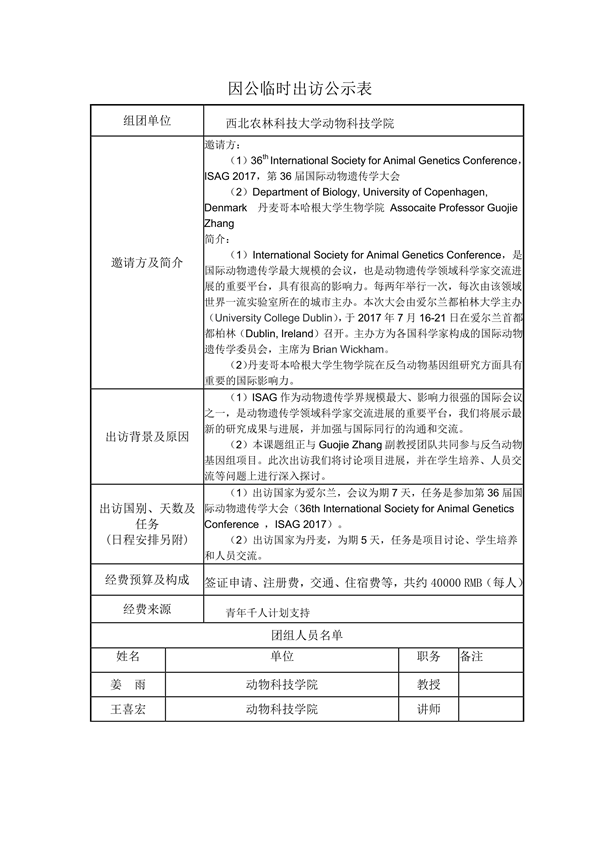 现将姜雨教授因公临时出国予以公示。公示期为2017年04月24日至2017年04月28日。如有意见,请以书面或以口头形式向党政综合办公室反映(110办公室樵淑银)。