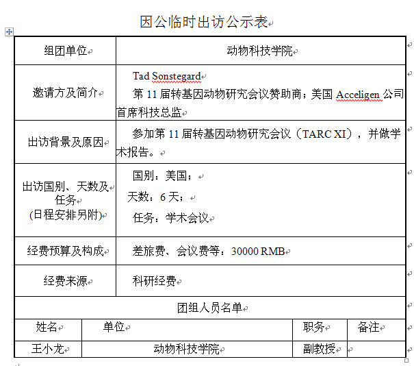 现将王小龙因公出国予以公示,公示期自2017年5月25日至2017年5月29日,如有举报意见,请及时以书面或以口头形式向宅宅爱动漫 党政综合办公室反映。