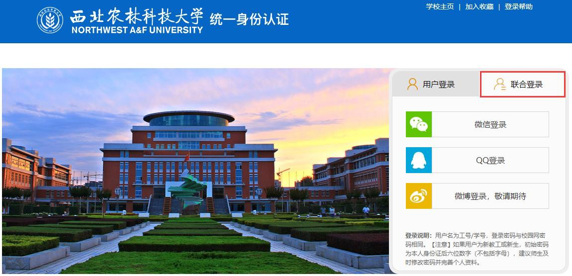 进入西北农林科技大学信息综合服务平台(//ehall.zzadm.com),点击页面中间或页面右上角的登录按钮。随后,跳转到统一身份认证页面,默认是学工号和密码登录的方式,点击如图“联合登录”的按钮。