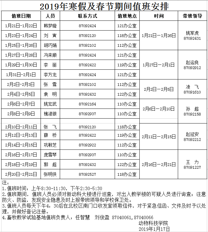 2019年寒假及春节期间值班安排