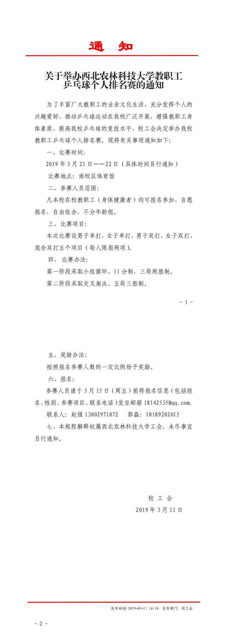 » 关于举办西北农林科技大学教职工乒乓球个人排名赛的通知