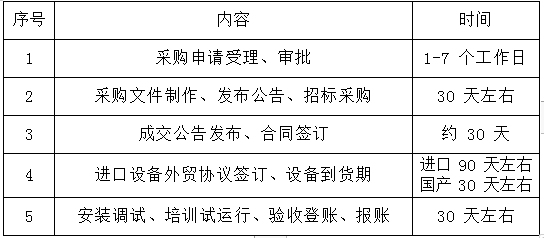 三、已完成采购项目前期准备工作的采购单位(包括前期调研、采购方案、技术参数的制定、50 万元以上大型/进口设备的论证及 200万元以上设备查重等内容),进口设备须在6 月30 日前提交采购申请,国产设备须在9 月 1 日前提交采购申请。如逾期提交采购申请,则无法确保本年度内完成采购计划及预算采购资金的支付,为避免各单位年底国库集中支付压力,请各单位高度重视、履行职责、切实加强项目管理,按期完成本单位采购任务。