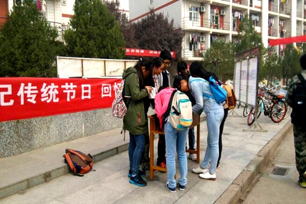活动开始前,工作人员提前到场,布置好活动现场,拉起横幅,对本次活动进行宣传。此次活动深深吸引了过往同学们的目光,他们对本次活动表现出了浓厚的兴趣,纷纷踊跃参与,写下了他们记忆中的重阳佳句,并于之后领取了回馈的小礼品。“遥知兄弟登高处,遍插茱萸少一人”,“九月九日望乡台,他席他乡送客”,一句句满含韵味的诗句,引得同学们纷纷细细品味,并不觉心生感慨,引发了自己的思乡之情。活动结束后,活动人员集体合影留念,为这场充满意义的活动画上了圆满的句号。
