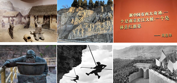 第一行:红旗渠展馆实拍图;第二行:土法水平测量仪,凌空除险、红旗渠通水庆典