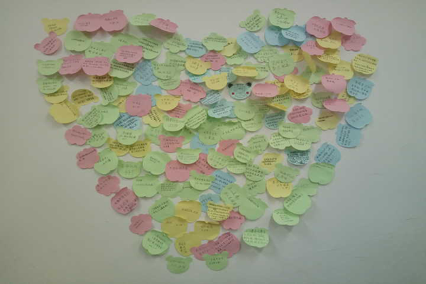 此次活动由勤工外联部和社会实践部共同举办。活动前期,活动负责人精心策划,工作人员分工合作,密切配合,以保证活动的有序开展。活动中,我院15级各班代班来到教室,与15级同学们亲切交谈,彼此之间深入交流,拉近了彼此的关系,活跃了整体气氛。通过学长学姐感情充沛的宣讲,现场气氛浓烈,同学们热情高涨,积极活跃地领取了留言小卡片并写下了自己的所想所感,同学们或是表达了对“雷风精神,志愿文明”的自我理解;或是透露自己将在雷锋月的秘密活动;或是表达自己对雷锋先生的怀念。活动最后,同学们自发地将小卡片贴在墙上,并将其构成了一个心型,表明了同学们的赤诚之心。