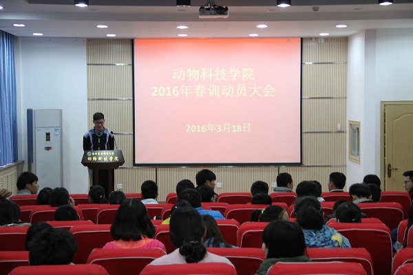 为积极备战校运动会,号召鼓励更多同学“走下网络、走出宿舍、走向操场”,3月18日,我院于动科楼107会议室举行2016年春训动员大会。我院体育辅导员任启俊、王斌,团工委书记李锐,辅导员张士军,100余名春训队员参加了此次大会。