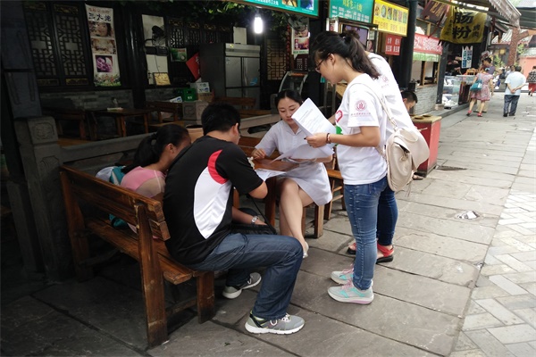 在前期准备阶段,经过队员与老师的讨论及网络查询,充分考虑到答卷时间、抽取人群及地市问题,最终制作出调查问卷问卷。在为期十一天的调研中,调研队一行七人分别在成都市区、大熊猫基地、文殊坊“非物质文化遗产•手工技艺主题街”、蜀锦织绣博物馆、杜甫草堂、邛崃、平乐等地针对不同人群进行调查问卷的发放。在发放问卷过程中,根据每人不同的想法,队员们分别行动,以每个想法为切入点与被调查者进行交流,并记录他们的看法、希望及针对问卷改良所提出的建议,以不断丰富完善调查问卷。在手工技艺比较发达的地区,被调查者对此次调研课题具有浓厚的兴趣,与队员们深入交流,一同探讨非物质文化遗产保护方面的措施,为非物质文化遗产保护工作贡献自己的一份力量,