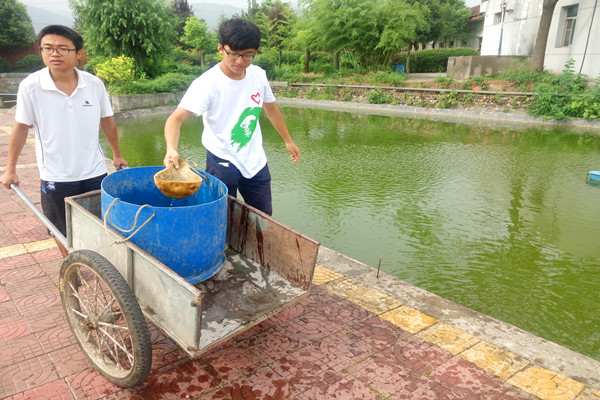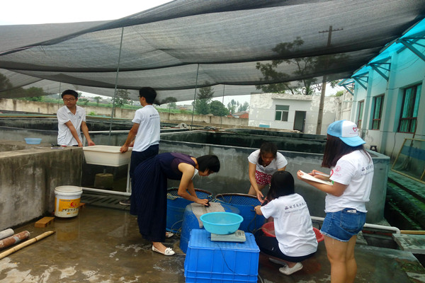 实际生产是基础,服务队成员们跟随基地科研助理符争走进鱼塘,参与每天最基础的生产工作。投饵、分鱼、投喂鱼药都充满了独特的趣味。同学们一边聆听符助理讲解投饵的不同方式与取得的效果,一边亲身投喂饲料,畅快地享受了一把投饵的欢乐与趣味。分鱼工作给队员们留下了劳累却快乐的回忆,队员们干劲十足,在亲密接触匙吻鲟的过程中,拥有了另一番别样经历。队员胡义贤谈道;“今天工作结束之后感觉很累,不过看到那些可爱的鱼儿们,就感觉非常满足。基地的学长学姐们都很刻苦,我很佩服他们的坚持。”同学们在实践中感悟这段珍惜时光。给大学生活添上了一笔亮丽的风景线。