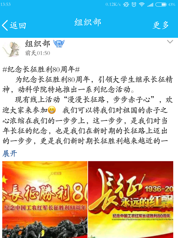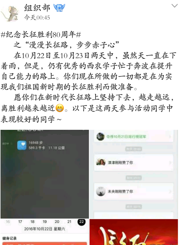 本次活动面向全体本科生展开,主要通过我院组织部官方QQ与同学们互动,新颖的活动方式广受大家关注。线上活动名为“漫漫长征路,步步赤子心”,旨在鼓励同学们在周末走出宿舍,学习知识和技能,丰富自我。同学们积极走进图书馆,浏览网页,查阅相关历史材料,积极学习长征精神。另外,活动通过分享链接组织同学们观看并学习了习近平总书记在长征胜利80周年大会上的发言,并对学习精神进行归纳总结,表达自己的学习感悟,并纷纷表示会走好新的长征路,走好自己的长征路,为中国梦的实现助力。动科宅宅爱动漫 李亦洲同学说:“此次活动形式比较新颖,不是教科书式的学习,而是自己参与其中,亲身去体验、反思,让我对长征精神有了更为实际的感触,收获满满的。”