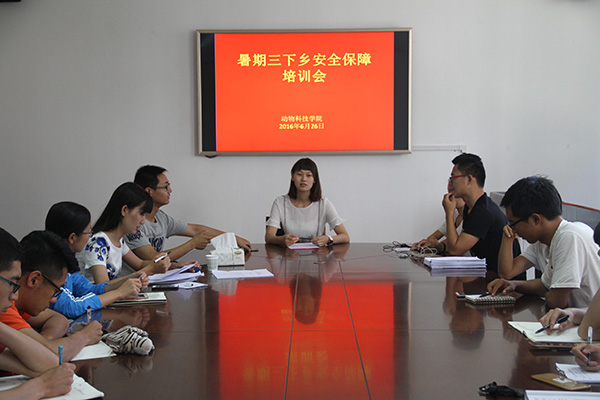 为保证2017年暑期三下乡活动顺利开展,提高队员们的安全意识和自我保护能力,保证队伍在假期时间安全高效地开展活动,6月27日,我院于动科楼104会议室召开了三下乡安全教育培训会。团工委书记闫颢芯老师、团工委副书记王健宇、往届优秀三下乡队长马锦荣出席本次会议并做重要发言,全体三下乡队长参加本次会议。