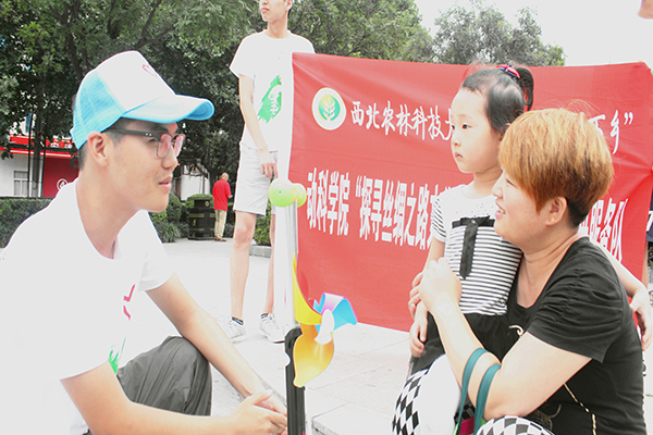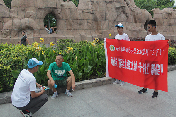 下午六时,队伍到达群雕附近,看到公园内有着大量的居民——有带孩子乘凉的妇女,有放风筝的老者,有在雕塑上攀爬玩耍的儿童,有结伴而行的夫妇……队员们将第一个采访目标定为了一对正坐在台阶边的母女。说明来意之后,采访人员先对小姑娘问了几个关于丝路文化知识的小问题,其中大部分孩子都不太清楚。孩子母亲告诉队员们,平时带孩子来群雕只是为了散步乘凉,而不会想起群雕所代表的历史,又因为孩子还小没有学到过相关知识,所以对丝路文化不太了解。随后在对孩子母亲的采访发现孩子母亲对丝绸之路文化也知之寥寥。采访结束后,同学们将自己制作的宣传单发给了那位母亲,并给小姑娘赠送了西农明信片。离开时队员们看到,那位母亲正拿着宣传单给孩子认真的讲述上面丝路文化的内容。整个采访进行了两个多小时,采访对象从老人至孩童共50人次,其中包含拒绝了同学们采访请求的部分居民。队伍副队长、动科宅宅爱动漫 辩论队成员赵铭峣同学在活动结束后表示:“今天是我的第一次采访,和打辩论赛不同,真的很紧张,而且被别人拒绝时也感到很尴尬,不过适应了便有勇气继续寻找下一个人。个人非常享受这个过程。”