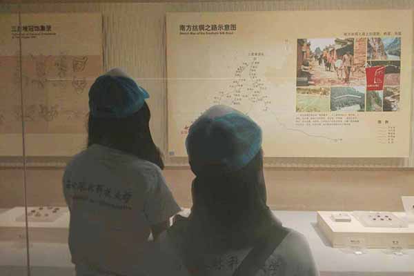 在当地居民的热情引领下,团队成员首先来到城中心,参观了雒城遗址,感受到了古代建筑的恢弘气势。雒城遗址,始建于东汉时期,历经多次战乱而遭破坏,明、清及民国时期几度修建,曾出土了一大批“雒城”和“雒官城墼”的汉代篆书体铭文砖、城墙砖,1991年4月,古雒城遗址被四川省人民政府核定公布为省级文物保护单位。随后队员们为探索南丝路的起源,来到了三星堆博物馆,大家跟着讲解员走进了博物馆中最大的、充满着神秘而引人的魅力的综合馆,馆内收藏的各式各样不同造型的文物令大家惊叹不已,无不赞扬古代人们的聪明智慧。馆里的青铜馆也是一大特色,青铜器以大量的人物,禽,兽等造型为其特征,表示了不同的含义。同时,大家了解到三星堆与南丝绸之路有着密不可分的关系:三星堆出土的黄金权杖、黄金面具等,都是与中亚、南亚文明交流的结果。专家认为,黄金权杖、黄金面具应该来自古代近东文明,而其中青铜面具高鼻深目的特征以及庄严肃穆的艺术风格,也与西亚雕像风格接近。中国丝绸最早通过南丝路出国,古蜀人通过“蜀身毒道” 为主线的南方丝绸之路,在先秦时期就已经开始了丝绸的出口贸易。结合史料记载以及最近几十年的考古发现,已经可以勾勒出一条从中国西南到印度,再到巴基斯坦至阿富汗,然后西去伊朗和西亚地中海的路线。这条路线正是南方丝绸之路西线途经的国际交通线。正如苏秉琦先生在《中国文明起源新探》一书所说:“四川的古文化与汉中、关中、江汉以至南亚次大陆都有关系,就中国与南亚的关系看,四川可以说是龙头。”