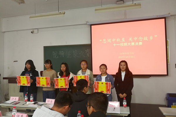 为排解同学们热切的思乡之情,我院生活部和勤工外联部联合推出“忽闻中秋至,关中念故乡”双节主题视频征集大赛,同学们积极参与,用视频记录自己眼中的家乡或是自己外出游玩的经历。最终遴选出十五份优秀作品进入决赛。10月15日,决赛于八号教学楼8107教室盛大举办,邀请团工委副书记王建宇、学生会主席田卜伊、宣传部部长熊小凡、新媒体部长曾鑫、新媒体副部彭扬辉、胡万佳作为嘉宾及评委。选手依次上台展示视频并讲述背后的故事:一张张相片,一帧帧的视频展示着父母的笑颜、家乡的美味、朋友的陪伴、故乡的山水;一句句描述,一声声讲解流露出对亲人的深切思念,对大学生活、新的家文化的炽热情感。其中动科1706班的集体作品尤其引人眼球,这份三十页的PPT里,每一张图、每一段文字、每一个名字,都展现着这个新生的班集体的可爱愿望,“我们来自五湖四方,却都汇聚在一个温暖的小家”。来自河南的谢婉婷为自己的乡愁做了一个精美的视频,里面有她的小村庄、有她离家的依依不舍,有她在西农遇到的新朋友,还有一次次令她内心成长的瞬间。真情的流露和生动的描述让评委和观众都身临其境,共品悲欢。最终动科1706班的集体作品摘得桂冠,谢婉婷的视频作品和梁君桐的文字作品并列第二。