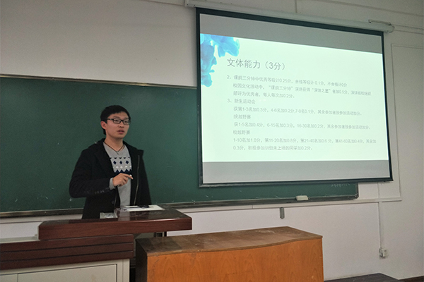 在十九大的胜利召开之际,为让我院新生担负起肩上的责任、明晰大学学习生活发展方向,并深刻了解创八、综测、阳光课时等重要评审体系,增强新生的规则意识,明确新生的课余学习任务,我院秘书处、勤工外联部与科创部于10月22日在三号楼212教室联合举办了综测创八阳光课时制度宣讲大会。出席本次大会的团学干部有秘书处处长丁彦之、勤工外联部部长赵慧、科创部副部李奕洲等人。此次会议还邀请到了校团委素质拓展中心副部长张志浩参加会议,另参与本次会议的有17级各班班长支书、勤外委员、科创委员及阳光团员代表。