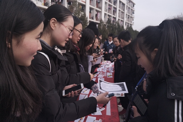 同学们在横幅签字