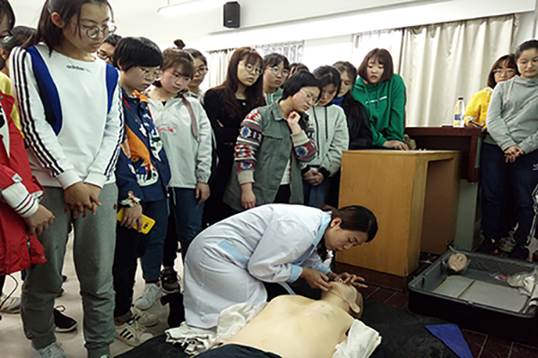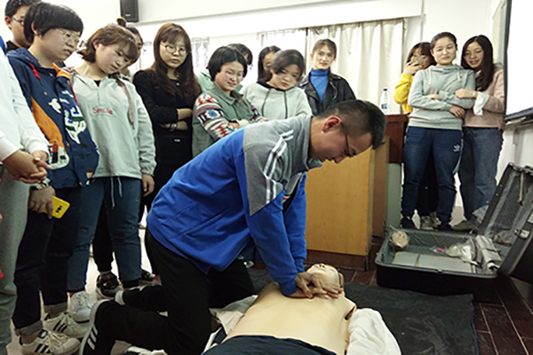 讲座伊始,陈医生通过幻灯片为细心讲解了大家目前最为关注的心脏骤停原因以及其表现,并详细讲解了促进心脏复苏的主要方法,还通过现身示范让大家能够准确掌握胸外按压等技巧。同学们兴致勃勃地竖耳倾听,同时认真做着笔记,不时跟着医生学习标准动作,希望通过学习把这些有用的知识传递给自己的家人和朋友,使更多人在遇到突发险情时,能够不只是会打电话呼救,而是能通过自己的努力挽救更多的生命。