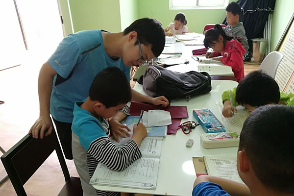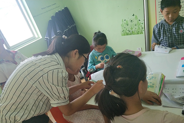 志愿者耐心为孩子们讲解习题