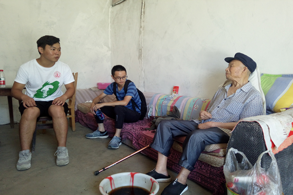 爬了一段陡坡,看见一处孤零零的住房,一位老爷爷拄着拐杖,颤颤巍巍地站在远处。村书记告诉队员们,这就是任光明。队员们扶着任爷爷进屋坐下,听他艰难地讲述了自己的家庭情况。任光明一家五口人,两个女儿均为残疾人,外嫁到了临近的镇上,儿子外出打工很少回家,家中只有两位老人。久病缠身,任爷爷已无法料理自己的生活,家中的所有事情全靠老奶奶操劳,医药费的花销占了生活开支的大部分。扶贫政策出台后,医药费的百分之九十由扶贫部门负责,给任爷爷一家减轻了许多负担。任爷爷表示十分感激政府的帮扶政策,给自己的生活带来了极大的帮助。村书记告诉队伍,医药费的负担,子女赡养义务的缺失,是导致任光明一家生活贫困的主要因素。