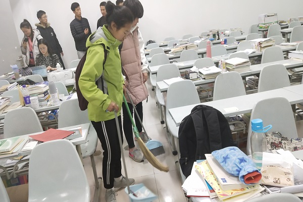 打扫工作是简单轻松的,但在活动过程中,考研自习室中黑板上醒目的“距2019年考研还有19天”、桌兜里的面包等营养品,还有在只有寥寥数人的考研室里却堆满了一整屋的书的情景震撼了2018级的新同学们。部委们为考研生改善了教室环境,而考研生用行动告诉了同学们刻苦、坚韧与毅力的含义。