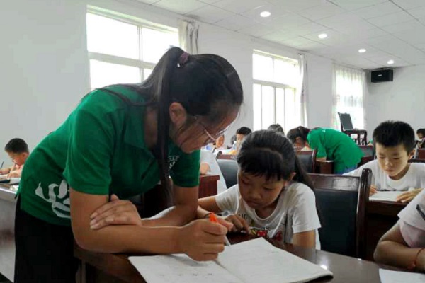 志愿者在解答孩子们作业中的问题