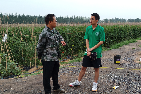在合作社技术员马天成的带领下,队员们首先来到了西瓜-茄子大棚种植基地。马天成曾毕业于西北农林科技大学,他见到校友来,倍感亲切,热情地接待了实践队,为队员们详细讲解了种植基地的生产经营情况。据了解,该种种植方式是当地近一两年发展起来的新型农业,一年两种,先种西瓜,再种茄子,实现创收。同时,在该乡吴书记的介绍下,队员们了解到,当地政府部门对种植基地也给予了大力支持。为鼓励当地农民积极种植大棚蔬菜,政府采取“盖棚补贴”的政策,在保证了当地农户的基本经济收入同时,也鼓励他们发展特色产业,实现脱贫致富,同时带动当地经济发展。