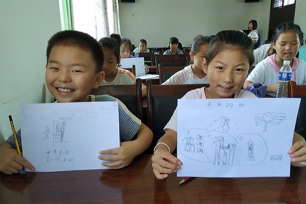 孩子们展示绘画课上的作品——“未来的我