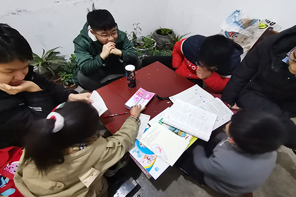 早晨九点,支教人员已经整装待发。迎着冬日的寒风,踏着清晨的阳光,支教的志愿者们前往了村子。在村委会的学习课堂上,志愿者们对孩子们进行作业辅导,耐心地为小朋友们讲解。遇到小朋友听不懂的问题时,志愿者会用另一种有趣的方式吸引他们,使他们更加专注,同时使他们更容易理解这个问题。辅导完作业后,志愿者和小朋友们进行了老鹰抓小鸡,丢手绢,踢毽子,老狼抓羊,彩虹过桥,抓鸭子等一系列游戏,现场的欢笑声此起彼伏,连绵不断。在很短的志愿时间里,孩子们青涩的面庞上总带着笑容。活动结束后,志愿者们与孩子们一起合影留念。