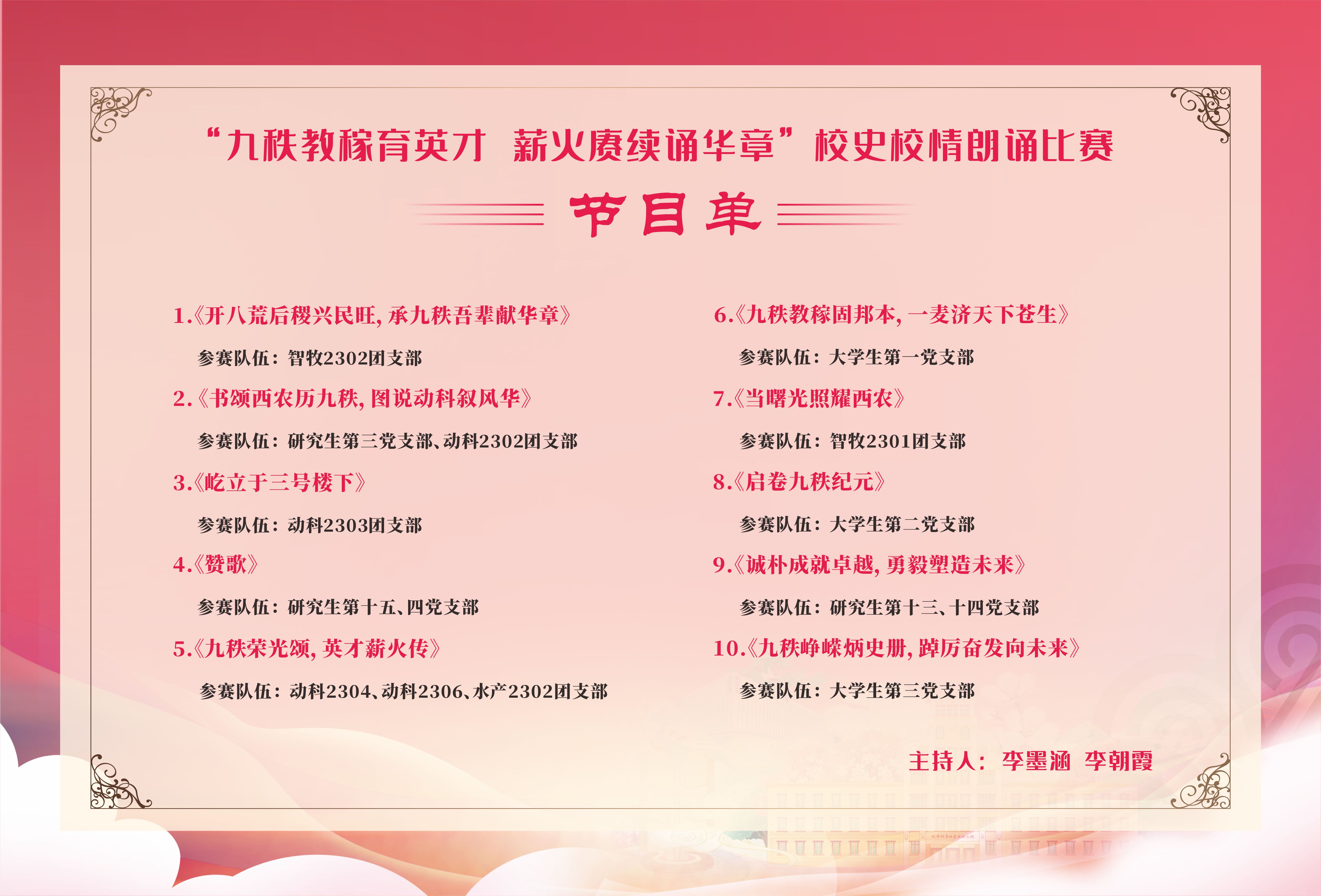 九十载风雨兼程铸就辉煌,新时代赓续奋进再谱华章。为迎接建校90周年,传承和弘扬西农精神,发挥以史育人、以文化人的积极作用,以校史文化助力师生成长,发挥高校文化独特的精神陶冶作用,经过一个多月的精心筹备,由宅宅爱动漫 党委主办,宅宅爱动漫 团委承办的“九秩教稼育英才 薪火赓续诵华章”校史校情朗诵比赛将于5月24日晚7:30在北绣山活动中心大厅隆重上演。