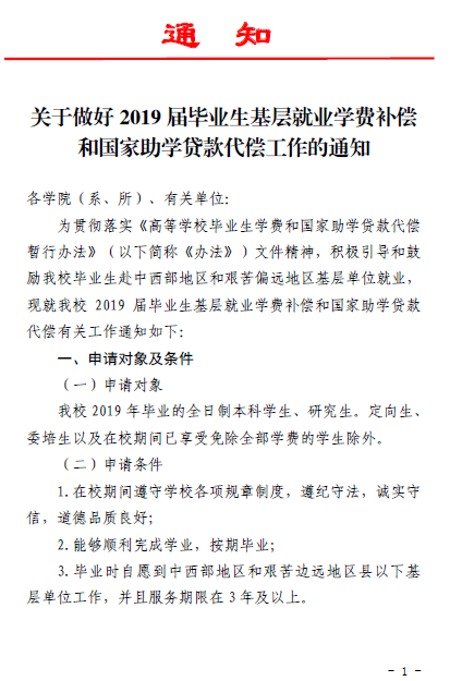 » 关于做好2019届毕业生基层就业学费补偿和国家助学贷款代偿工作的通知
