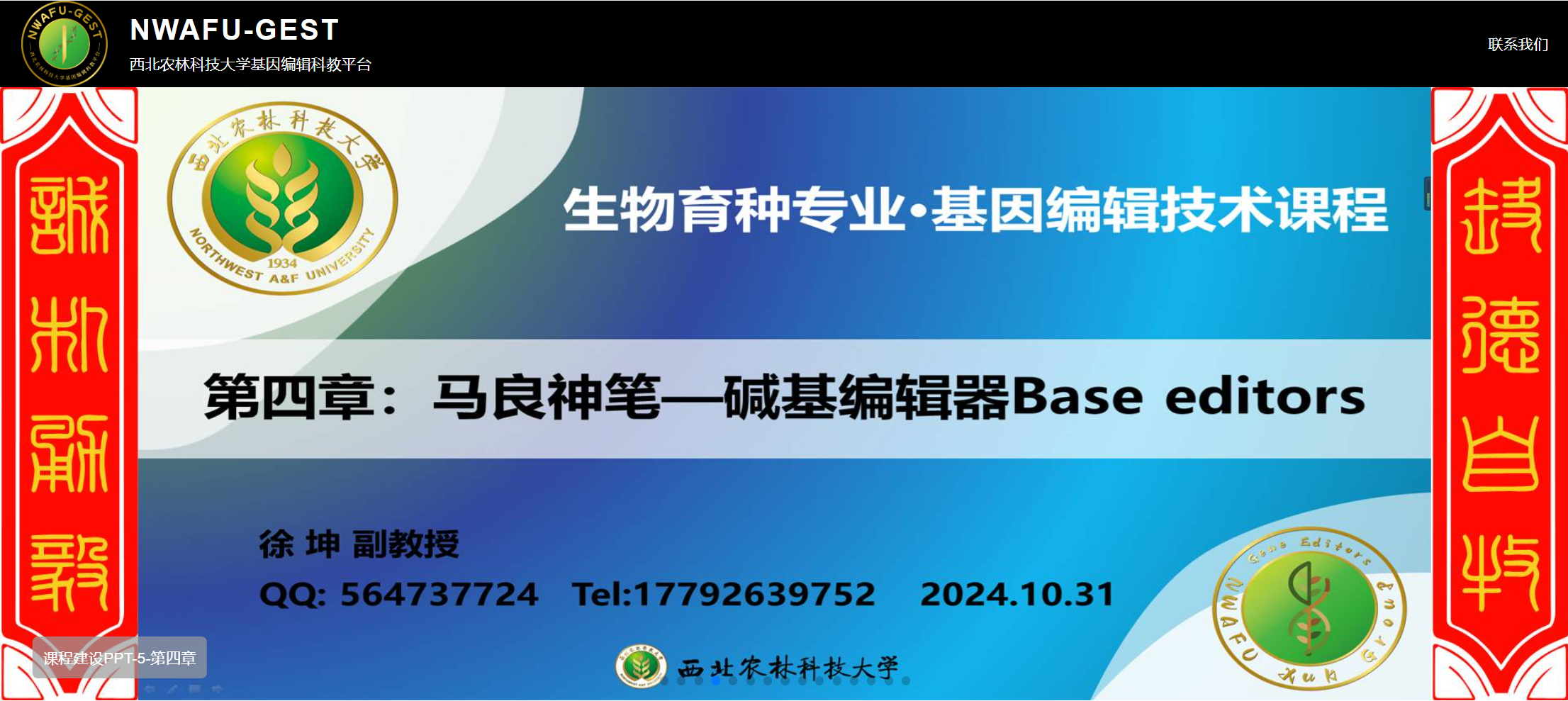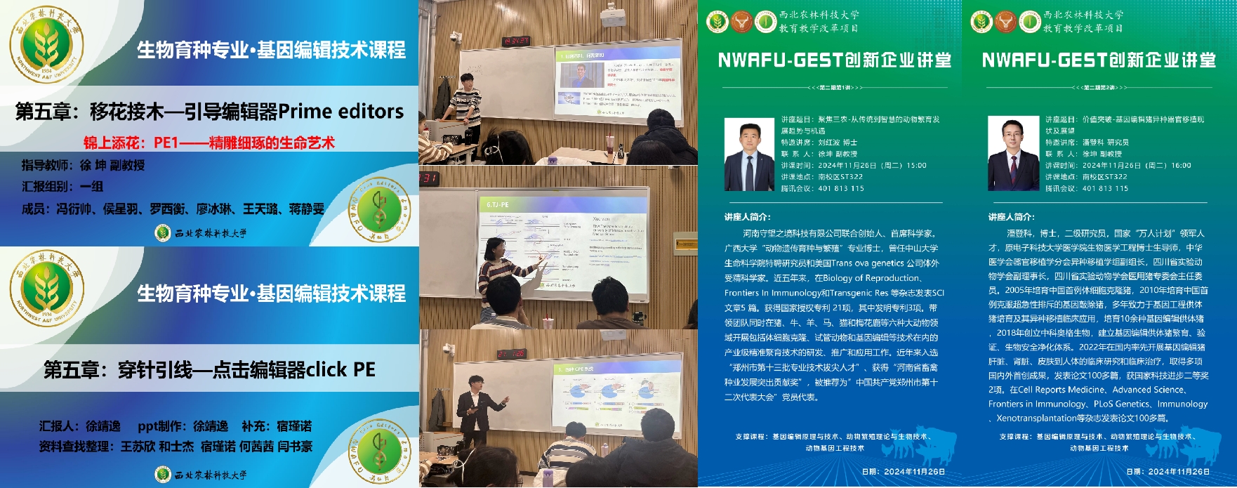 课程由有着近10年基因编辑相关教学经验的徐坤副教授担任主讲,由在羊生物育种领域颇具影响力的王小龙副院长和学校新引进的基因编辑领域高层次人才魏迎辉教授进行专题讲座。课程团队已于2024春/夏学期顺利完成了新开研究生课程《基因编辑原理与技术》的首次授课,并在学校和宅宅爱动漫 的大力支持下打造了西北农林科技大学基因编辑科教平台(The Platform of NWAFU Gene Editing Scientific Teaching, NWAFU-GEST;//lab.gewu.pro/groups/index/U1Y0L9)。