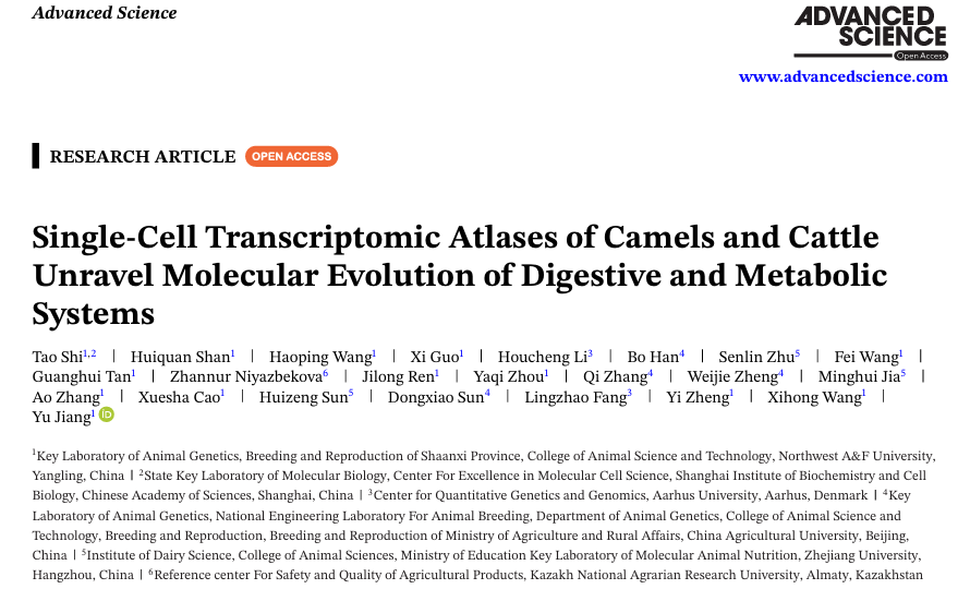 近日,我院动物大数据与功能基因组团队姜雨教授课题组在国际期刊《Advanced Science》在线发表题为“Single-Cell Transcriptomic Atlases of Camels and Cattle Unravel Molecular Evolution of Digestive and Metabolic Systems”的研究论文。该研究通过构建骆驼与奶牛多组织单细胞转录组及空间转录组图谱,系统揭示了多胃动物在消化、代谢与肾脏系统中的细胞层面进化创新,为理解环境适应性演化及家畜性状定向改良提供了全新的理论框架与细胞靶点。