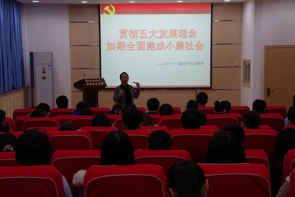 会上,李娜副教授向同学们深刻剖析了党的十五届五中全会会议精神,全会强调,如期实现全面建成小康社会是我们党确定的“两个一百年”奋斗目标的第一个百年奋斗目标,“十三五”时期是全面建成小康社会决胜阶段。实现“十三五”时期发展目标必须遵循坚持人民主体地位,坚持科学发展,坚持深化改革,坚持依法治国,坚持统筹国内国际两个大局,坚持党的领导六项基本原则;并牢固树立贯彻创新、协调、绿色、开放、共享的五大发展理念。