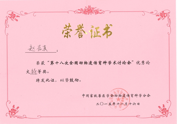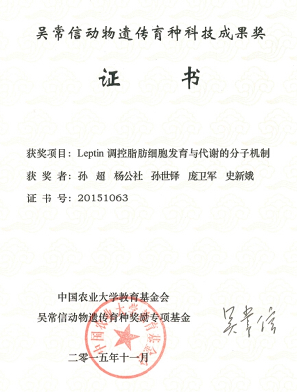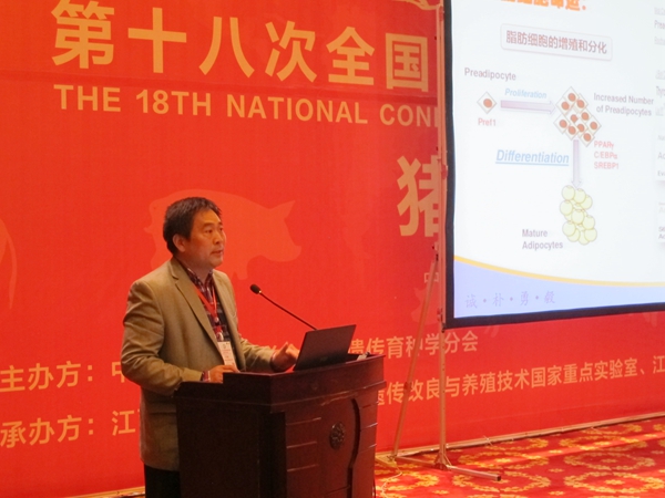 我院杨公社教授率团队23名师生参加大会,并应邀主持了猪遗传育种分会场报告。本次学术研讨会上,孙超教授做了题为“FoxC2决定脂肪细胞命运的分子机制”的专题报告;庞卫军副教授做了题为“猪脂肪沉积及其调控机理研究”的大会报告;博士生赵存真做了题为“MAT2B通过PI3K-AKT 和ERK信号通路促进猪肌内脂肪细胞分化”的报告。团队研究成果“Leptin调控脂肪细胞发育与代谢的分子机制”荣获吴常信动物遗传育种科技成果奖,博士生赵存真获优秀论文奖。