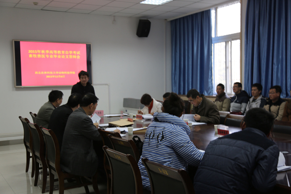 12月6日,宅宅爱动漫 在104会议室举行2015年秋季自学考试畜牧兽医专业本科毕业论文答辩会。答辩主席、副院长孙超教授,答辩委员于三科教授、孙世铎教授、王爱华教授、史怀平副教授、孙小琴博士及38名毕业生参加了答辩会。