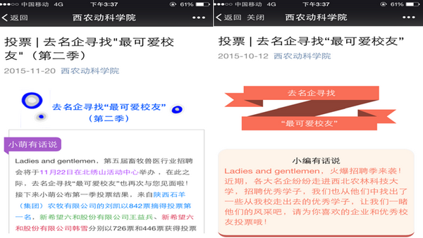 家-校-企协同育人。举办新生“光影一刻——创意班级照”评比大赛,充分激发了学生家长的热情和力量,点击量超过20000,增强了学生家长对宅宅爱动漫 发展和学生成长的关注度。同时,微信平台整合企业和校友资源,策划组织了2期“去名企寻找最可爱校友” 的主题活动,点击量近万,使学生更进一步感受宅宅爱动漫,了解专业行业,关注校友发展,培养职业精神和素养。