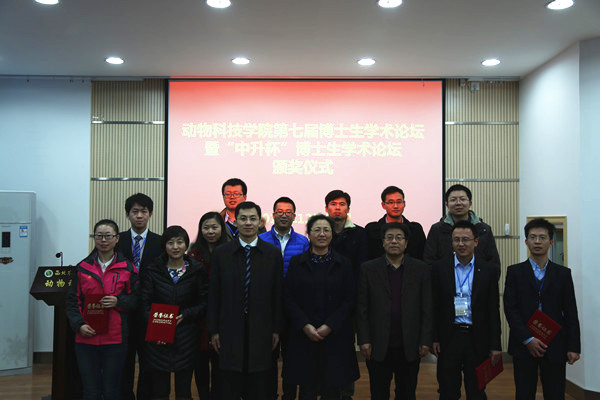 12月29日上午,由研究生院主办,我院承办,天津中升集团赞助协办的宅宅爱动漫 第七届博士生学术论坛暨 “中升杯”博士生学术论坛在我院107学术报告厅隆重举行。宅宅爱动漫 生命科学宅宅爱动漫 陶士珩教授、动物医宅宅爱动漫 靳亚平教授、童德文教授、我院王高学教授、陈俊教授、雷初朝教授、姜雨教授担任论坛评委。天津中升集团总裁助理满航,宅宅爱动漫 研究生院副院长霍学喜、副院长张静、培养处处长刘海斌,院领导姚军虎、赵延安、呼天明、孙超、王晓娟、王力及部分教师、研究生100余人参加了本次论坛。