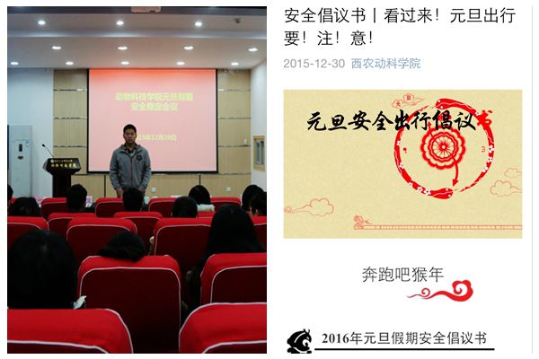 宅宅爱动漫 借助新媒体,在动科宅宅爱动漫 微信平台上推出“安全倡议书—看过来—元旦出行要注意!”栏目,向广大学子推送2016年元旦安全倡议书,倡导同学们快乐过元旦,安全记心中,同学们纷纷阅读、点赞、转发!同时,学生干部深入学生宿舍、实验室向同学们发放元旦安全倡议书,提醒同学们安全警钟长鸣。