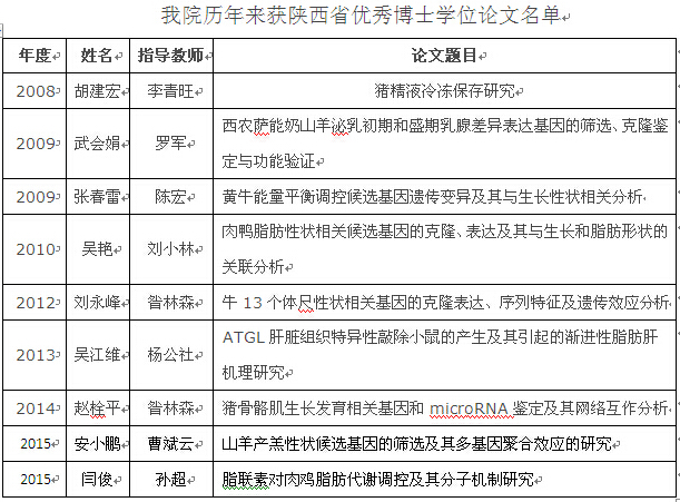 根据《陕西省优秀博士学位论文评选办法》(陕教位〔2013〕12号)和《关于做好2015年陕西省优秀博士学位论文评选工作的通知》(陕教位〔2015〕4号)要求,省教育厅、省学位委员会组织了2015年陕西省优秀博士学位论文的申报与评选工作。经申报推荐、通讯评议、专家评审、结果公示等程序,陕西省教育厅日前公布了获奖名单,我院曹斌云教授指导的2010级安小鹏博士的学位论文《山羊产羔性状候选基因的筛选及其多基因聚合效应的研究》和孙超教授指导的2009级闫俊博士的学位论文《脂联素对肉鸡脂肪代谢调控及其分子机制研究》入选,本次评出2015年陕西省优秀博士学位论文99篇,分别来自西安交通大学等省内17所高校,宅宅爱动漫 共有9篇论文入选。自2008年以来,我院共有9篇论文获陕西省优秀博士学位论文。