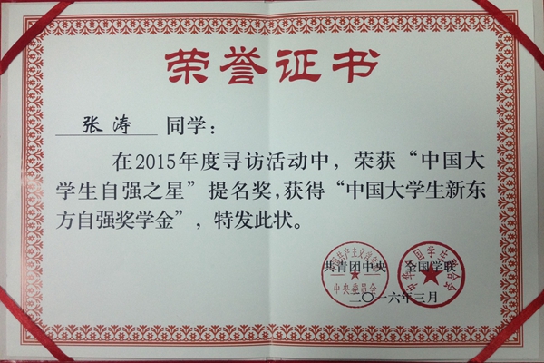 近日,由共青团中央、全国学联主办的2015年度寻访“中国大学生自强之星”活动揭晓,我院2012级动物科学2班张涛同学荣获“中国大学生自强之星”提名奖。