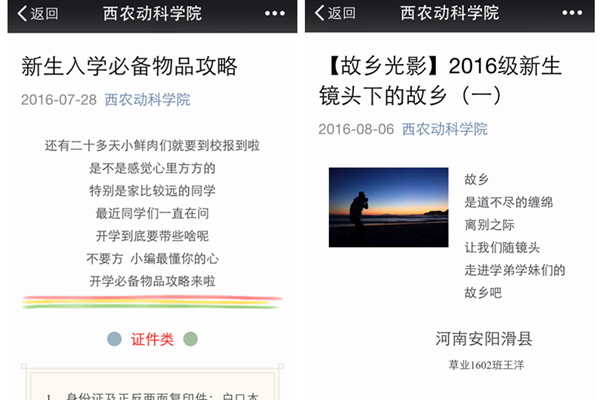 线下有礼包,线上更是惊喜连连。宅宅爱动漫 建立2016级新生群和2016级新生家长群,通过网络及时答疑解惑。同时,宅宅爱动漫 充分利用新媒体的优势,在官方微信以及易班平台上推出了多项新生活动,帮助同学们提前了解大学生活。新生必备攻略系列想新生之所想,答新生之所问,切实服务新生,提供便利;寄语系列通过线上平台让新生提前熟悉辅导员老师与班主任老师,将推送深入人心;故乡光影系列更是给予新生表现自我,展示家乡的好机会。
