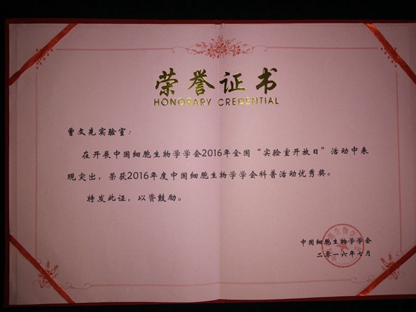 近日,我院曾文先教授团队荣获2016年度中国细胞生物学学会科普活动优秀奖。2015-2016学年,曾文先教授团队举办多项科普公益活动,反响热烈,受到了陕西传媒网,西安光明网,陕西细胞生物学会官网等6家媒体的广泛报道。为鼓励我院师生积极参与科普工作,我院党委书记赵延安同志,亲自为组织人员书写科普工作者奖状。