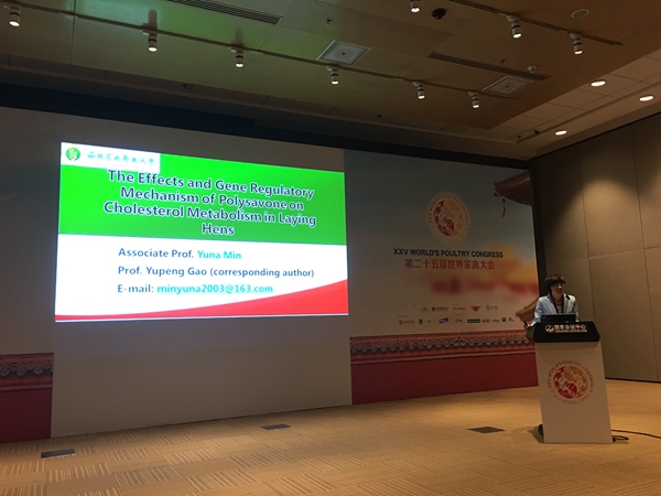 我院高玉鹏教授率团队成员闵育娜副教授、王哲鹏副教授等7人参加了会议。闵育娜副教授代表研发团队在分论坛会上作了题为《The Effects and Gene Regulatory Mechanism of Polysavone on Cholesterol Metabolism in Laying Hens》报告,阐述了苜草素调控鸡蛋品质和胆固醇代谢以及蛋鸡健康的分子机制,引起了与会同行的浓厚兴趣,并进行了互动交流。同时,我院研发团队的《Effect of Polysavone on Laying Performance and Feed Nutrient Utilization of Laying Hens at Peak Production》等5篇论文优选在墙报宣传展示,《Discussion on the effects and gene regulatory mechanism of polysavone on cholesterol metabolism in laying hens》等6篇论文收录本届WPC论文集。
