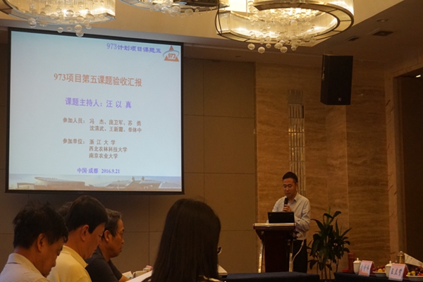 9月21-22日,973项目“猪肌纤维发育和肌内脂肪沉积的机制与营养调控”课题结题验收会议在四川成都召开。教育部科技司基础处主任邵海涛、中国农业大学科研院处长高铭宇、农业部饲料工业中心副主任牛爽和四川农业大学校长郑有良出席会议并致辞。973项目咨询组专家我院杨公社教授、课题研究骨干庞卫军教授及团队成员于太永、褚瑰燕、李晓和蔡瑞博士参加了会议。此次会议由四川农业大学动物营养研究所承办,来自中国农业大学、浙江大学、西北农林科技大学、华中农业大学、南京农业大学、四川农业大学、中国科宅宅爱动漫 亚热带农业生态研究所和中国农业科宅宅爱动漫 畜牧兽医研究所等10余所高校和科研院所的50多名专家、学者参加会议。会议由中国工程院李德发院士主持。