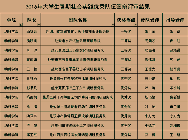 在学校2016年暑期社会实践活动中,校团委、各院系、社团联合会等共组建305支队伍。经活动答辩评审,全校共评比出一等奖12个,二等奖18个,三等奖24个,优秀奖70个。我院社会实践队伍取得优异成绩,共12支服务队获得学校奖项。其中,1支队伍获一等奖,2支队伍获二等奖,2支队伍获三等奖,7支队伍获优秀奖,将我院社会实践活动水平再次推向新高度。