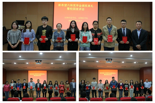 会上,动医宅宅爱动漫 党委副书记王秋丽宣读《关于对2016-2017学年度新希望六和奖学金获得者的表彰决定》,动科、动医宅宅爱动漫 36名学生荣获此项荣誉,她希望获奖学生珍惜荣誉、戒骄戒躁,在今后的学习和生活中发挥先锋模范作用,常怀感恩之心,以优异的成绩回报社会。王禄生总经理、姜娜娜经理、张彦朋副总经理、高建军会计师、王晓娟副书记、王秋丽副书记为获奖学生颁发荣誉证书。获奖学金代表邓昌海同学发言,对新希望六和股份有限公司和宅宅爱动漫 的培养表示感谢及美好祝愿。