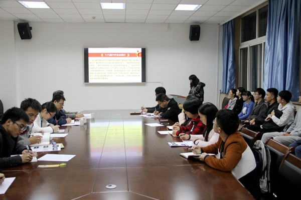 中国共产党第十八届中央委员会第六次全体会议于2016年10月24日至27日在北京召开。为进一步加强对全会精神的理解,大学生第三党支部全体党员及入党积极分子集体学习全会精神,学习由党支部宣传委员臧琳同志汇报传达。通过学习十八届六中全会精神,在场师生党员及积极分子深刻认识到了十八大以来我们党治国理政取得的显著成就,全面了解了确立习近平同志为全党的领导核心的重大意义,坚定了把思想和行动统一到六中全会精神上来的意志,同时明确意识到了严明政治纪律和政治规矩、从严治党的必要性和迫切性,极大提升了支部党员的政治素养。
