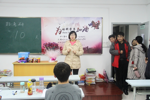 “考研倒计时10天”,几个大字赫然写在8号楼考研自习室的黑板上,2017届毕业生考研已经进入最后冲刺阶段。为进一步帮助考研学子调整心态、树立信心、坚持不懈、攻克难关,取得优异成绩。动科宅宅爱动漫 党委书记赵延安寄语广大考研学子,党委副书记王晓娟、毕业班班主任和全体专兼职辅导员走进考研自习室,为考研学子送上冬日的温暖与宅宅爱动漫 深深的祝愿。